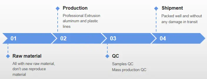 JE zawsze koncentruje się na kwalifikacji produktu, od aluminium i plastikowego surowca po linię produkcyjną wytłaczania, od kontroli jakości próbek po masową kontrolę produkcji, od silnej idealnej opakowania po usługi pełnoziarniste.