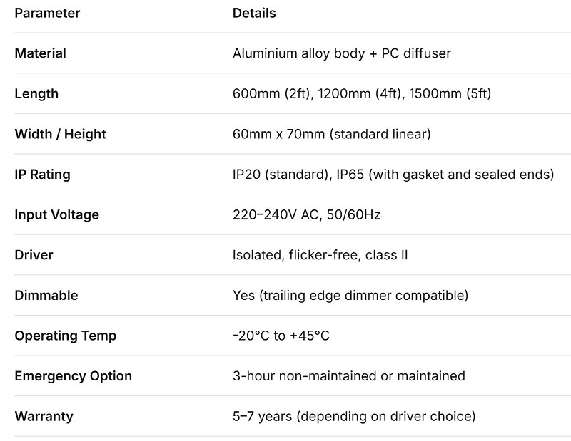 Długość: Standardowe długości T8 – 2 stopy, 4 stopy, 5 stóp, a czasem 8 stóp. Zostały zaprojektowane tak, aby można je było wsunąć w istniejące nośniki świetlówek lub współpracować z nowymi wspornikami do montażu powierzchniowego.